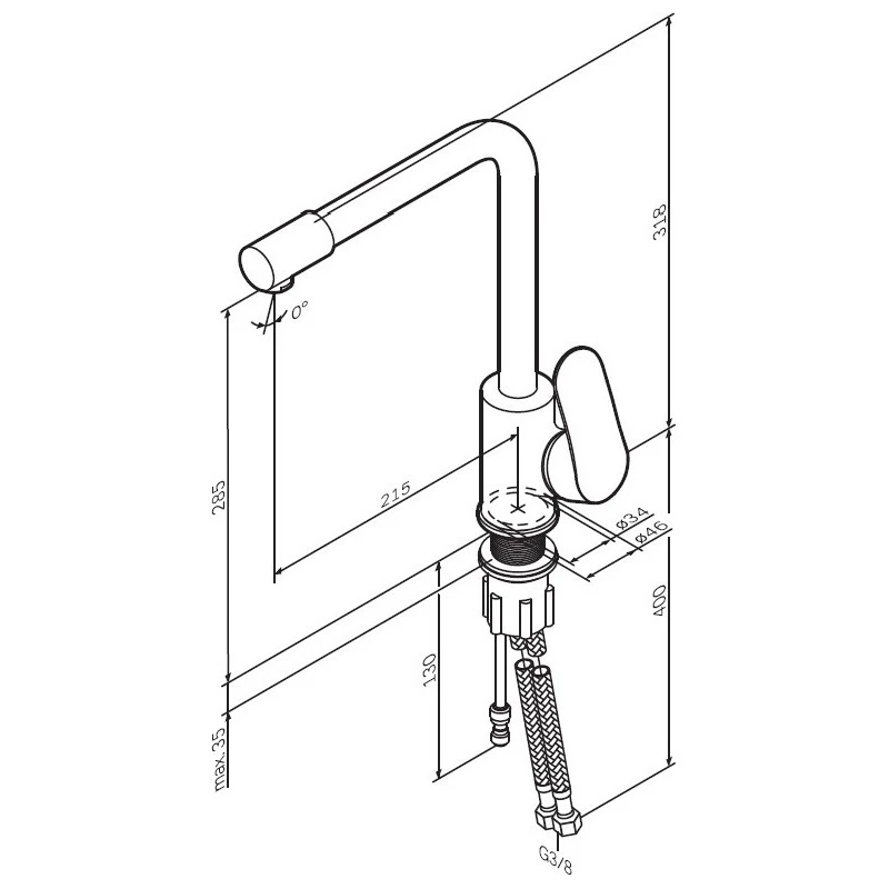 - Підведення води: гнучке, G 3/8