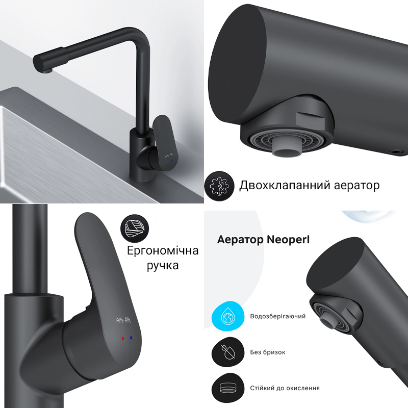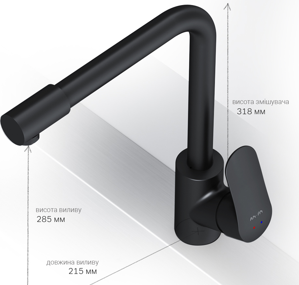 | Особливості | L-подібний високий вилив, Керамічний картридж AM.PM SoftMotion 35 мм (плавна та тиха робота), Окремий незалежний канал для фільтрованої води (Fresh Boost) |